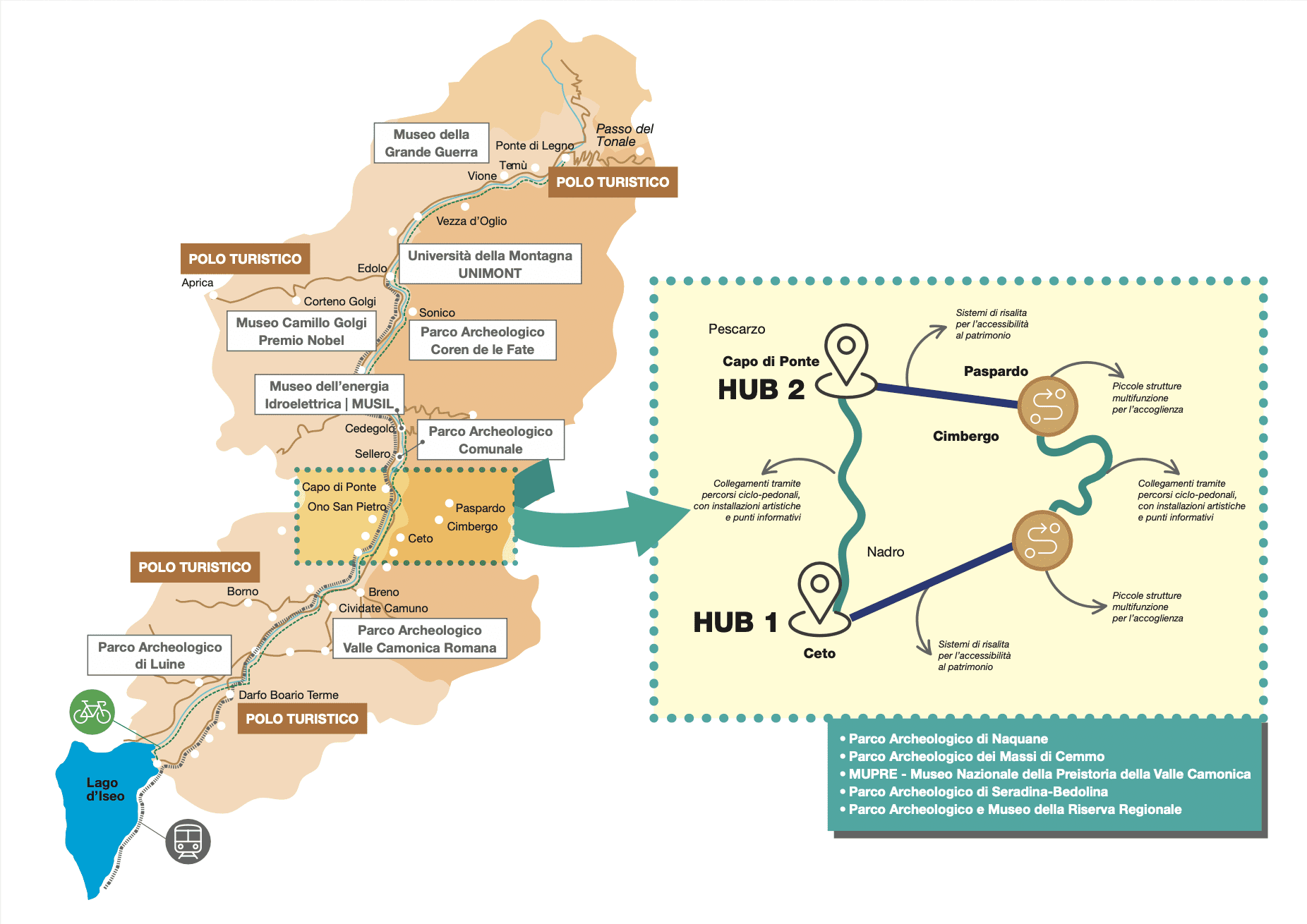 Si tratta di un sistema composto da due “hub” o piattaforme di fruizione di cui uno a Ceto, ipotizzato nell’area dismessa della NK, ed uno a Capo di Ponte nell’area di fondovalle, collegati da percorsi, sentieri ciclabili e sistemi di mobilità in quota che porteranno ad una visita facilitata e accessibile ai parchi archeologici, fungendo da centri propulsori e di rilancio di tutto il patrimonio culturale camuno.
